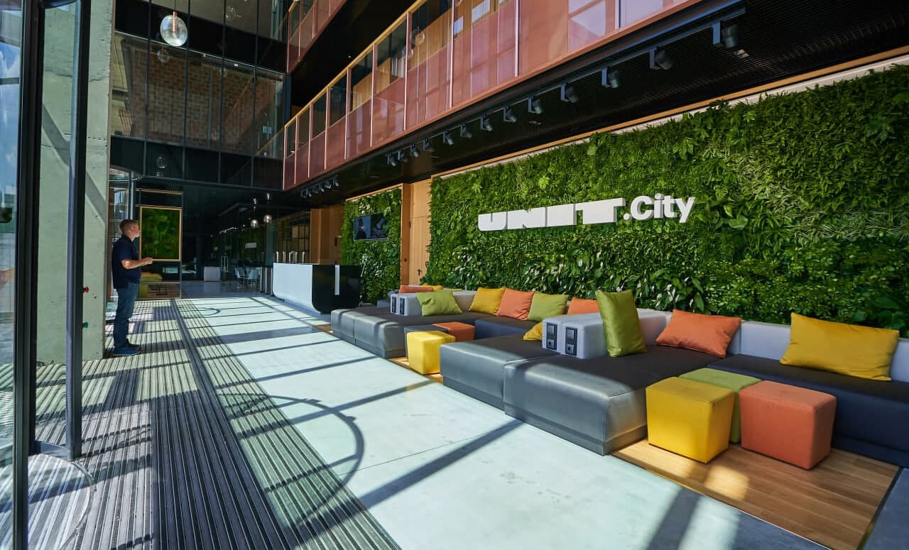 At UNIT.City, when renting an office, a significant advantage for you is the unique modern industrial architecture, mobile greening systems, walking areas.