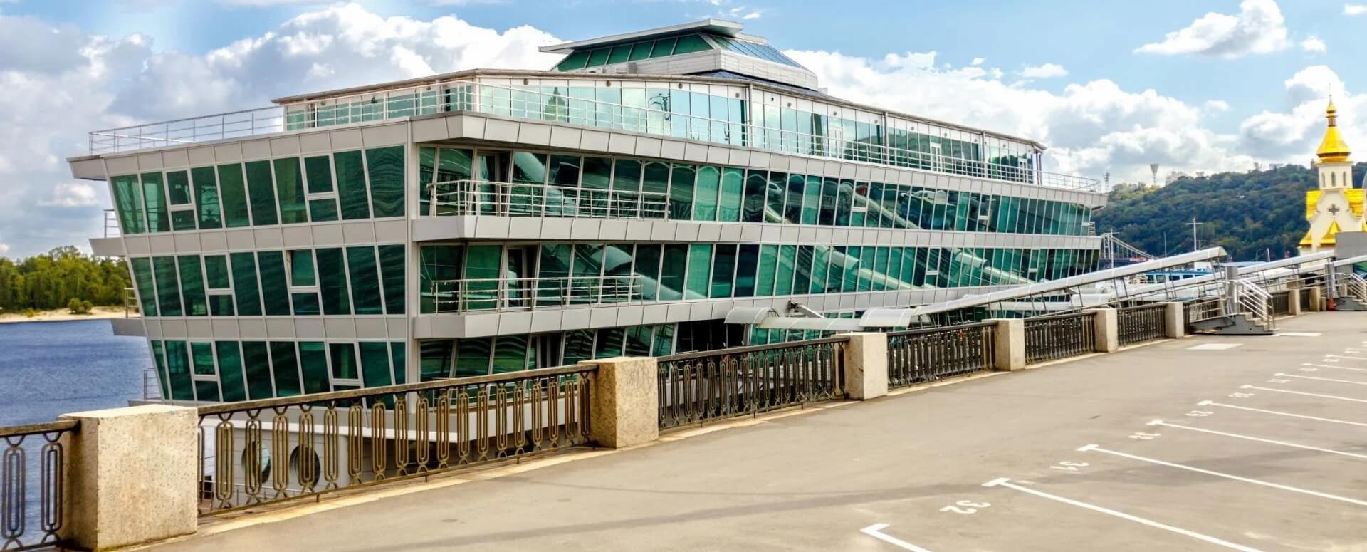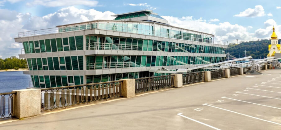 Dnipro Plaza, the only business center on the water in Ukraine. The uniqueness of the object is that it is not a building, but a landing stage, which is moored to berth No. 4 on Naberezhno-Khreshchatitskaya.