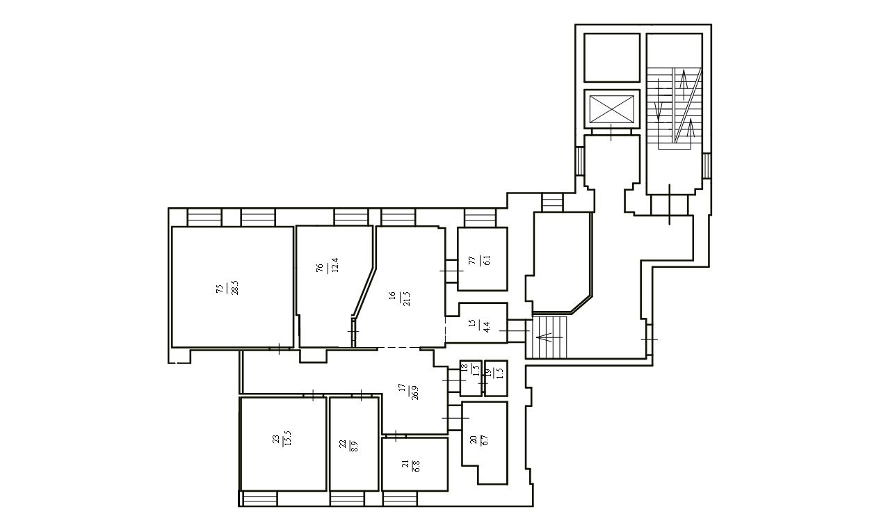 Площадь типового этажа - 500-600 кв.м (площадь этажа отдельного блока)